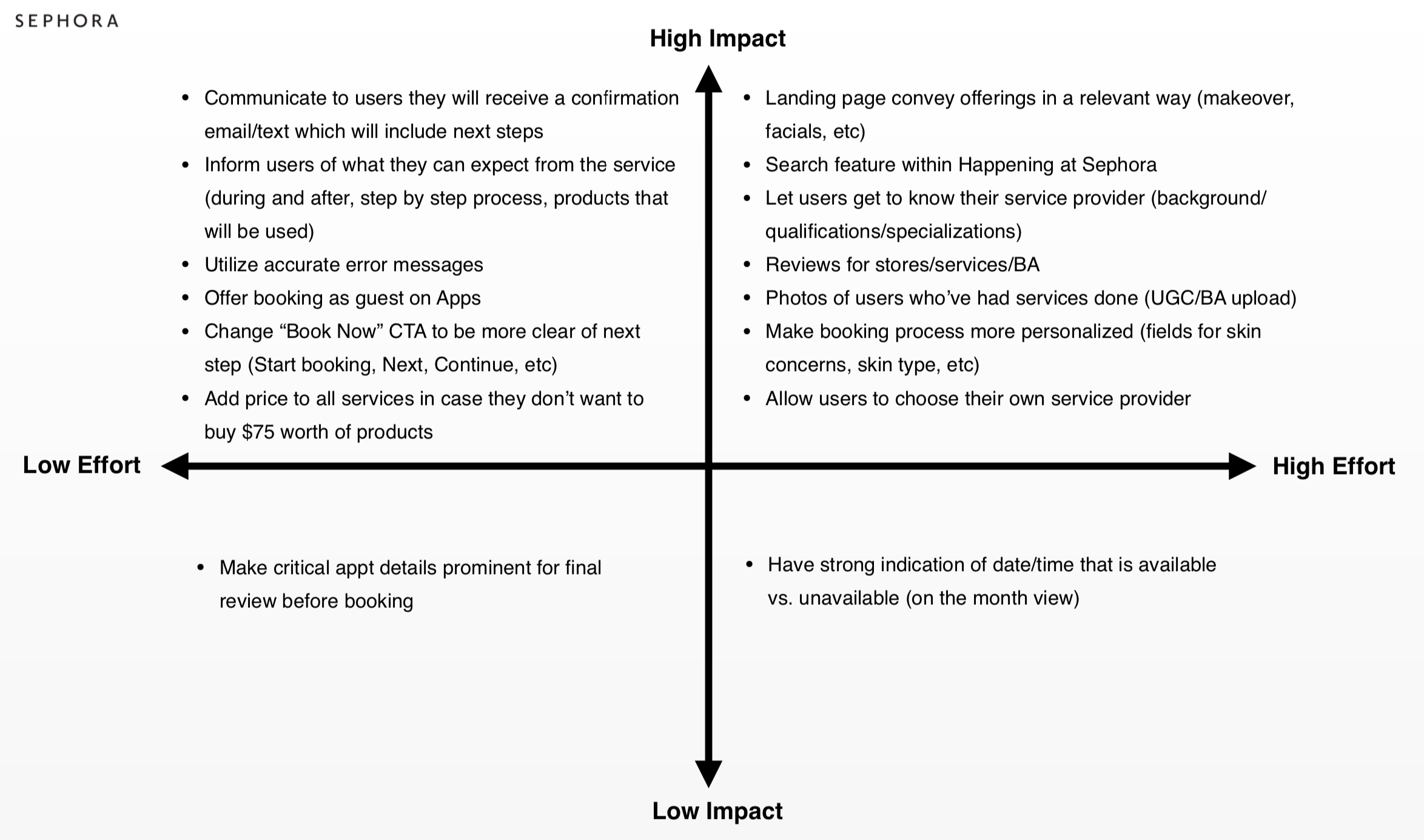 I am so proud of the work that I did on this project. The foundational research, brainstorming sessions, and subsequent designs were well received by internal stakeholder and user testers. It was a fever dream to work on a project that had the potential to be used by millions of users on an eCommerce giant like Sephora. Unfortunately, the business decided not to continue investing in expanding Sephora’s in-store services which was the foundation of this redesign.